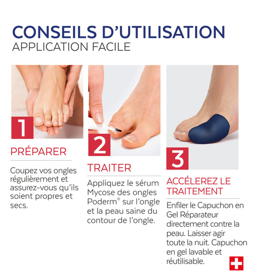 Le sérum Mycose des ongles PODERM® agit en formant un film lipidique protecteur sur l’ongle, éliminant la mycose et favorisant le renouvellement de l’ongle sain. Le Capuchon en Gel Réparateur PODERM® renforce la réparation nocturne en gardant le sérum en contact direct avec l’ongle touché par la mycose, favorisant ainsi une guérison plus rapide. Le capuchon en gel intensifie l'action du sérum et prévient le risque de contagion en isolant l'ongle infecté.