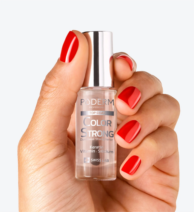 Pour protéger et sublimer vos ongles tout en leur apportant un soin ciblé, Poderm propose deux top coats aux actions complémentaires : le Top CoatColor Care et le Top Coat Color Strong.