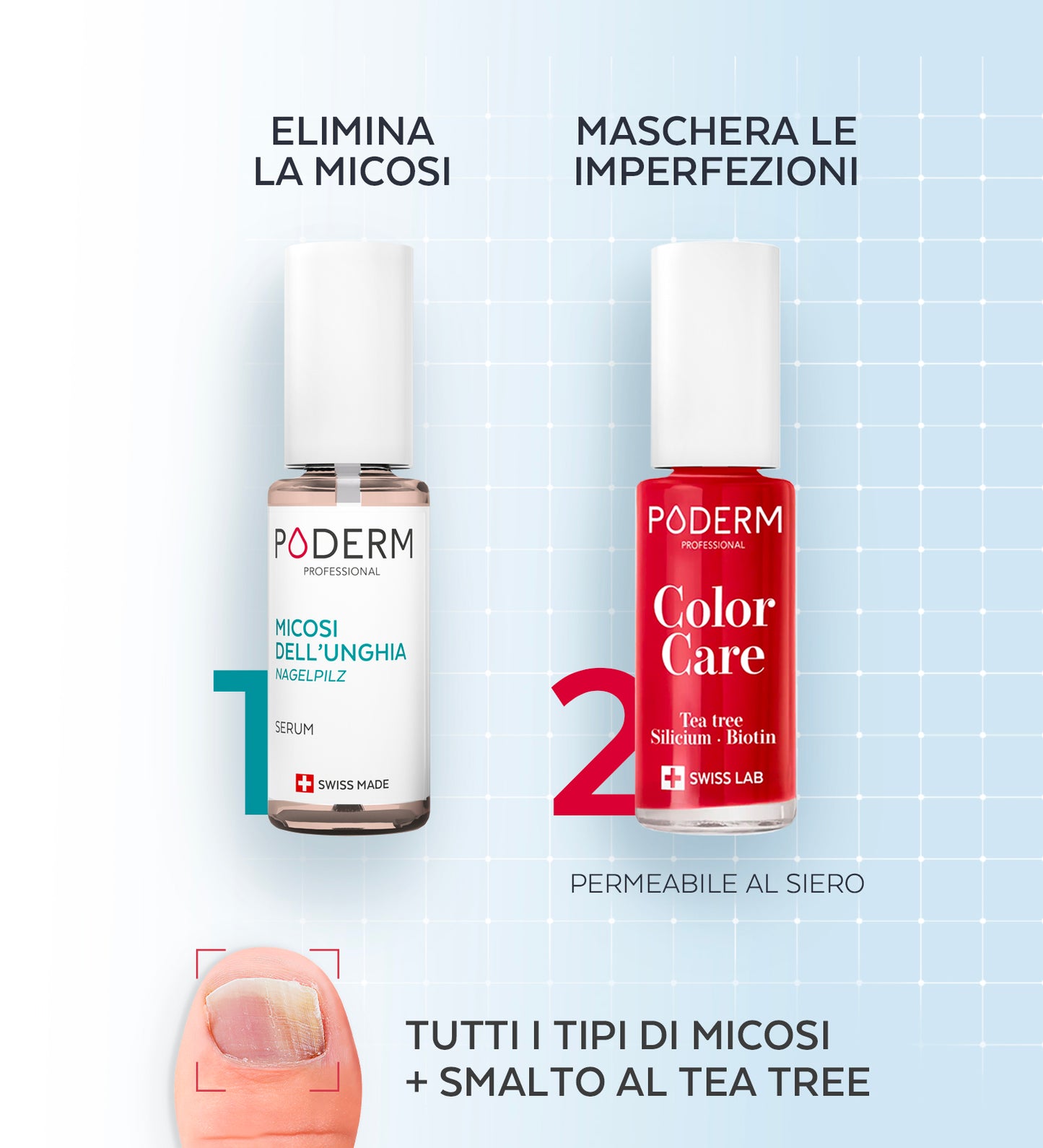 PODERM® Nail Mycosis Serum combatte efficacemente il fungo responsabile della micosi ungueale, agisce meccanicamente, forma un film lipidico protettivo e favorisce la naturale rigenerazione dell'unghia.