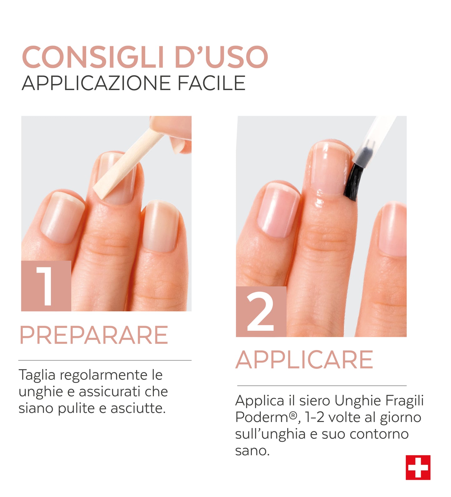 Applicare PODERM® Serum 1 o 2 volte al giorno sull'unghia e sul suo contorno (cuticole e solchi).