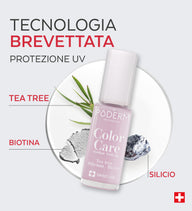 Lo smalto Color Care è stato appositamente studiato per correggere e nascondere le imperfezioni delle unghie gialle, danneggiate e striate, che possono essere causate da infezioni fungine, smalto in gel o semipermanente, o dall'uso di prodotti chimici come il gel idroalcolico. La sua formula traspirante e permeabile permette ai sieri PODERM di penetrare senza interrompere un trattamento in corso.