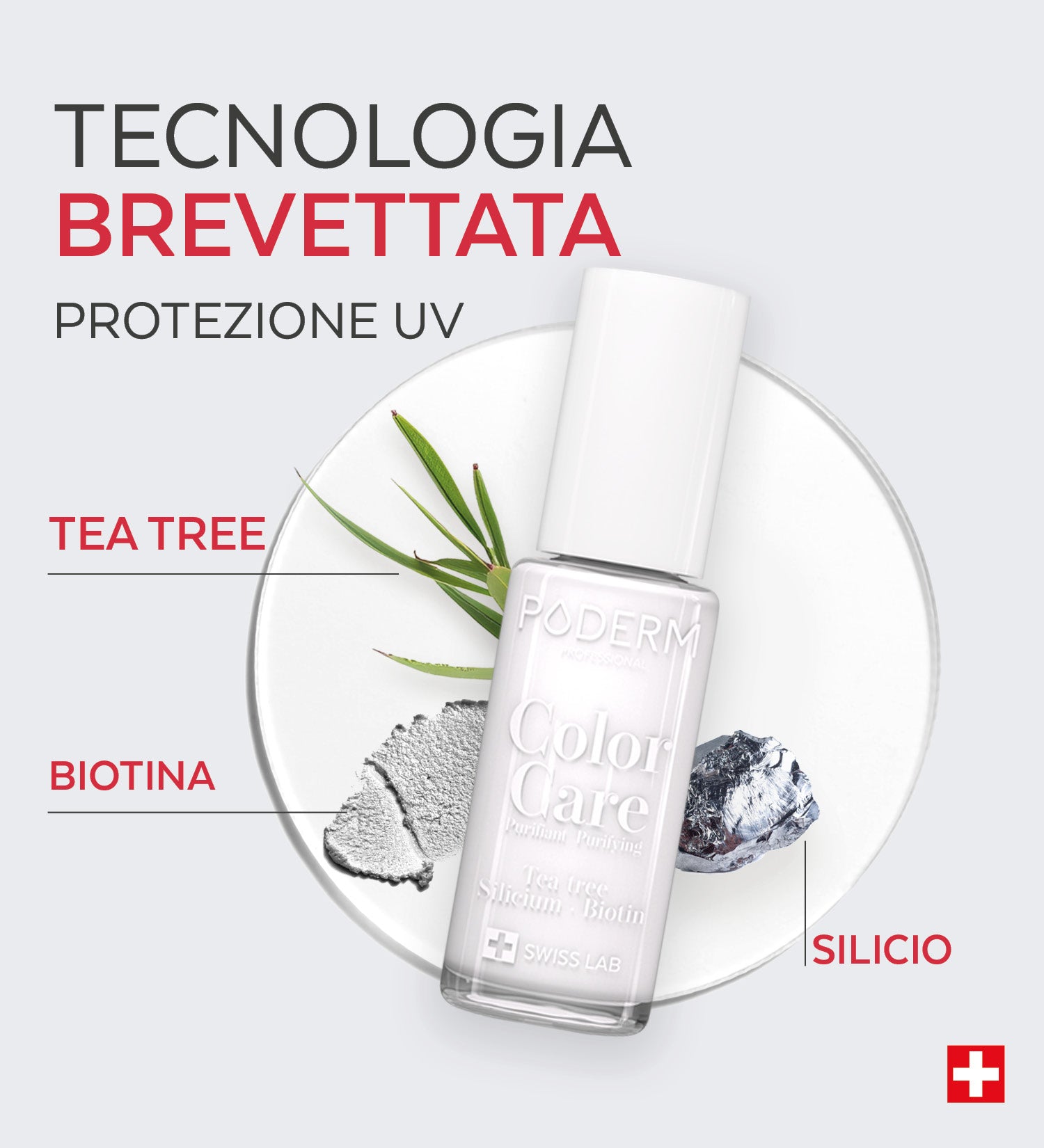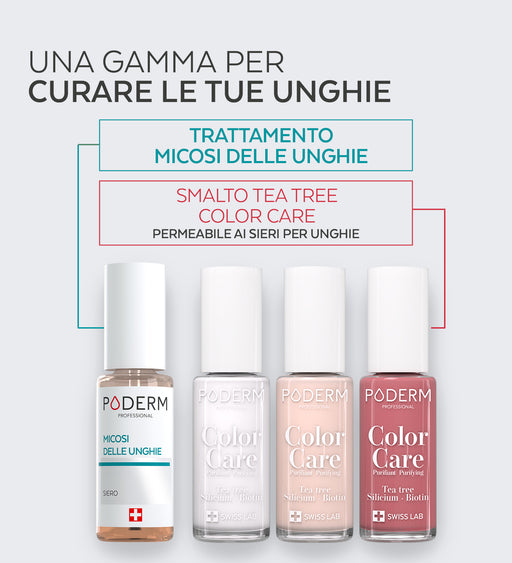 Lo smalto Color Care è stato appositamente studiato per correggere e nascondere le imperfezioni delle unghie gialle, danneggiate e striate, che possono essere causate da infezioni fungine, smalto in gel o semipermanente, o dall'uso di prodotti chimici come il gel idroalcolico. La sua formula traspirante e permeabile permette ai sieri PODERM di penetrare senza interrompere un trattamento in corso.