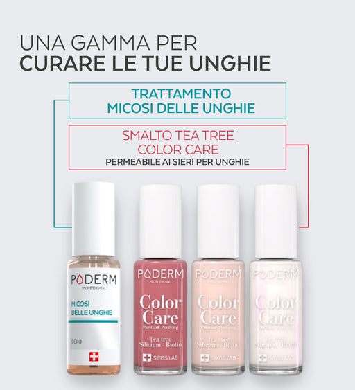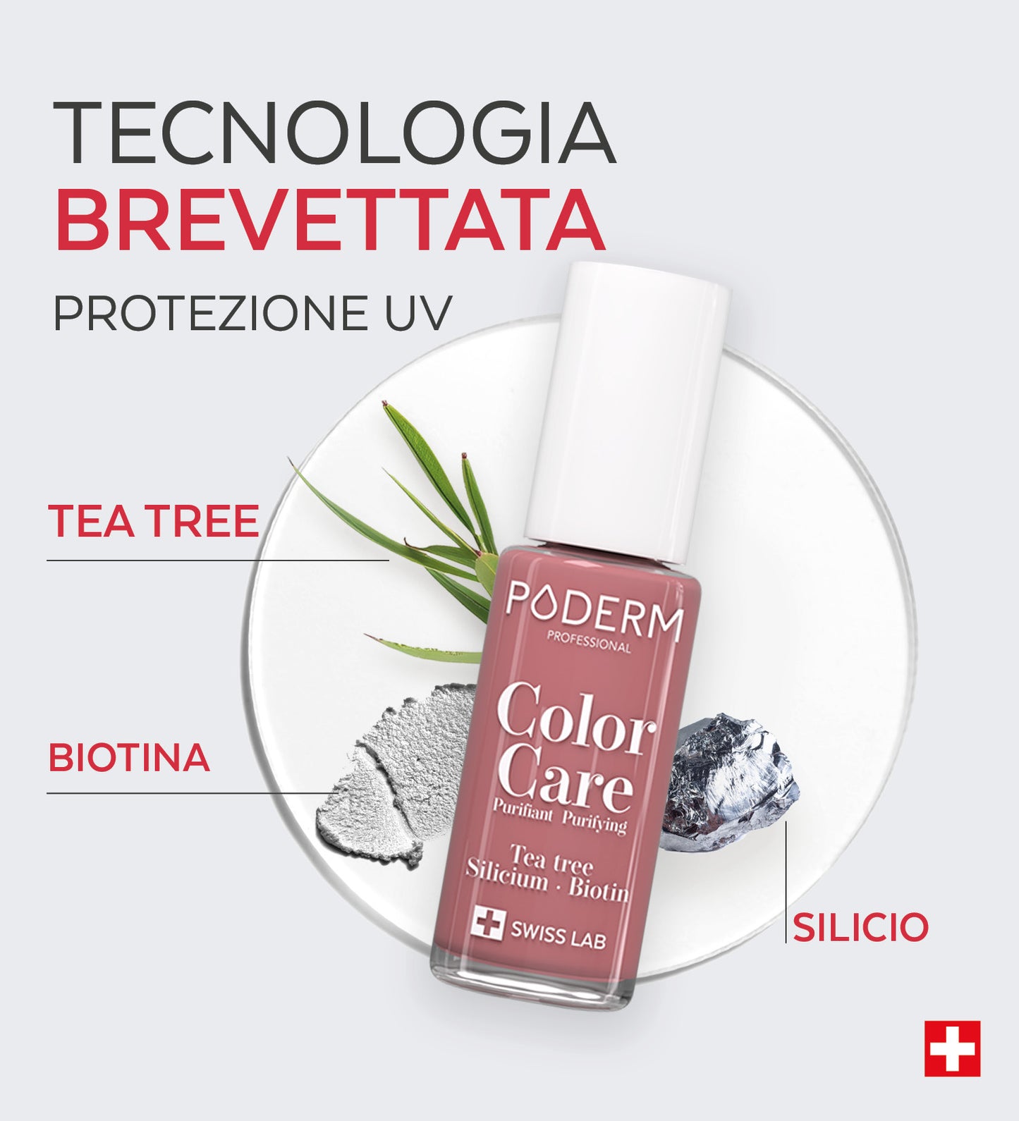 Lo smalto Color Care è stato appositamente studiato per correggere e nascondere le imperfezioni delle unghie gialle, danneggiate e striate, che possono essere causate da infezioni fungine, smalto in gel o semipermanente, o dall'uso di prodotti chimici come il gel idroalcolico. La sua formula traspirante e permeabile permette ai sieri PODERM di penetrare senza interrompere un trattamento in corso.