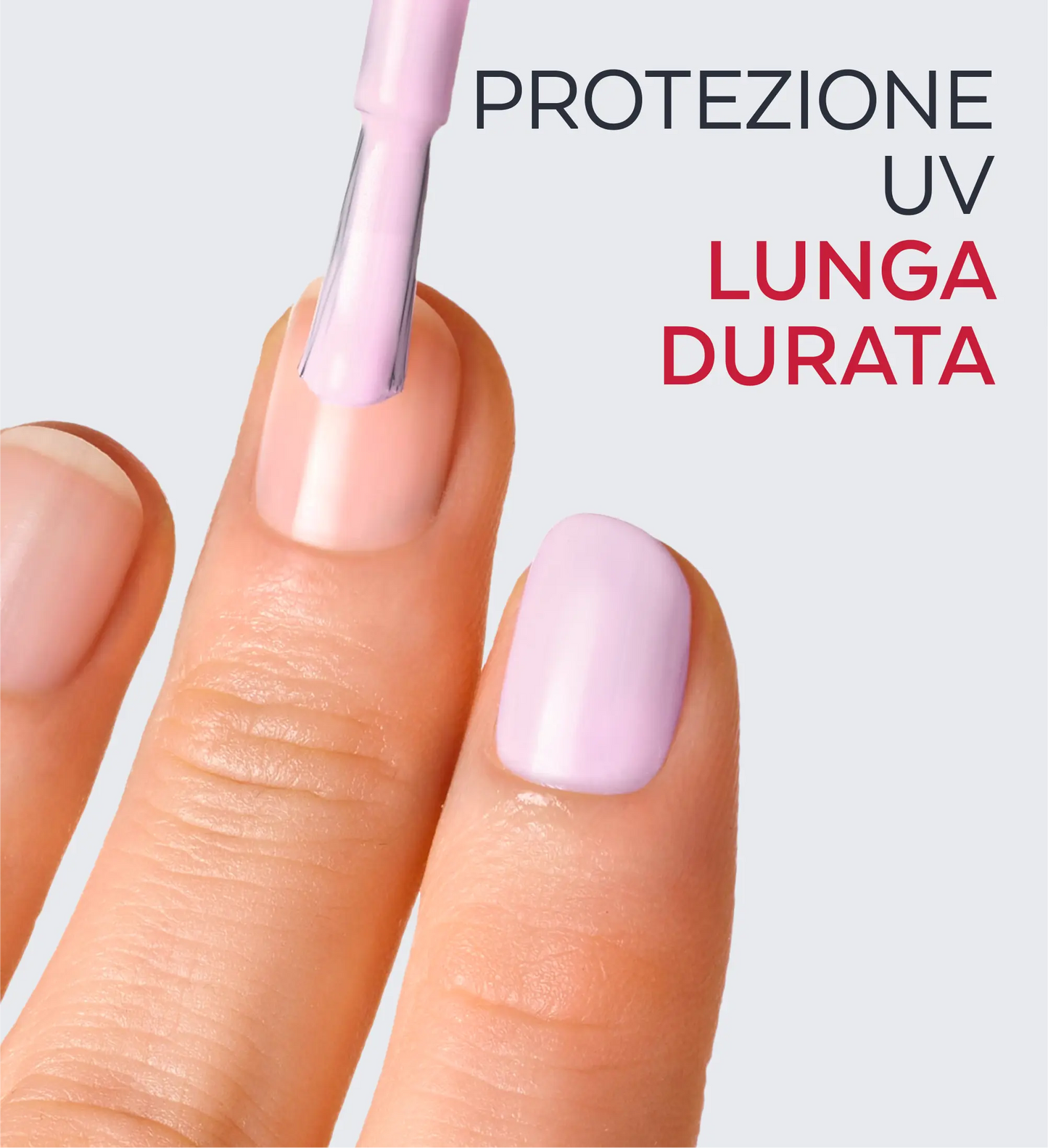 Gli smalti Color Care e Color Strong offrono una protezione UV per proteggere le unghie e la pelle sotto l'unghia dai danni causati dai raggi solari (esclusi top coat, base coat, gloss vitality e gloss éclat).