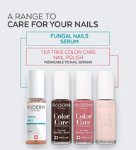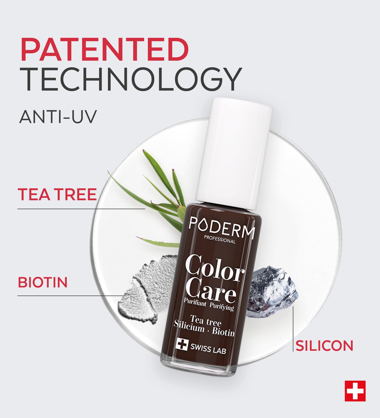 Lo smalto Color Care è stato appositamente studiato per correggere e nascondere le imperfezioni delle unghie gialle, danneggiate e striate, che possono essere causate da infezioni fungine, smalto in gel o semipermanente, o dall'uso di prodotti chimici come il gel idroalcolico. La sua formula traspirante e permeabile permette ai sieri PODERM di penetrare senza interrompere un trattamento in corso.