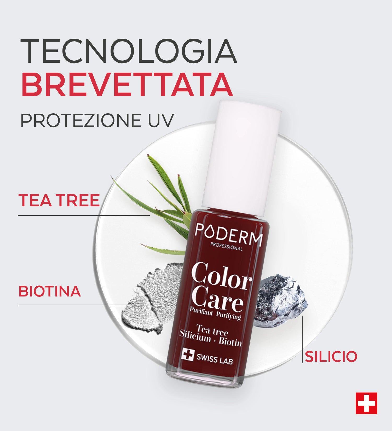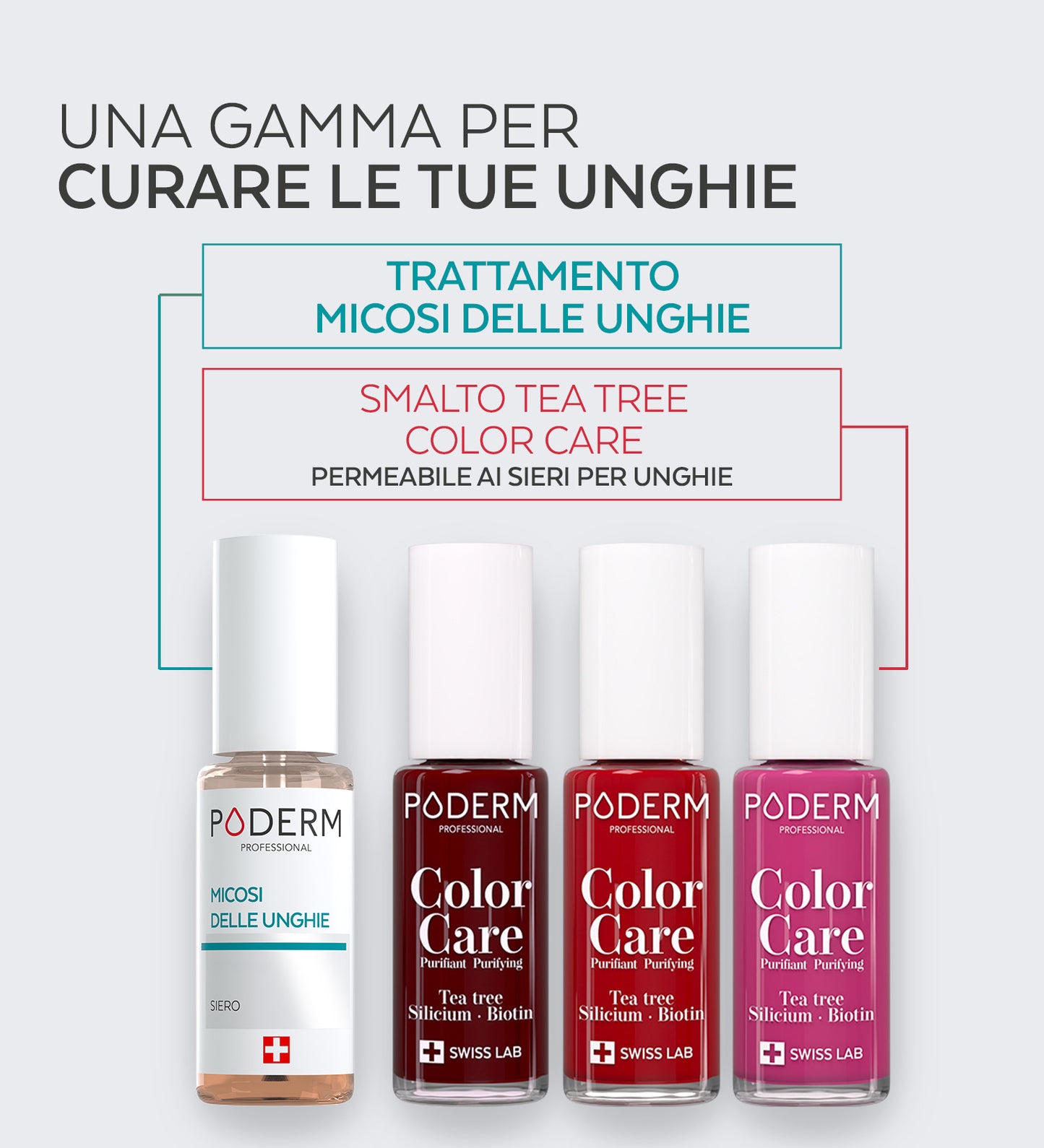 Lo smalto Color Care è stato appositamente studiato per correggere e nascondere le imperfezioni delle unghie gialle, danneggiate e striate, che possono essere causate da infezioni fungine, smalto in gel o semipermanente, o dall'uso di prodotti chimici come il gel idroalcolico. La sua formula traspirante e permeabile permette ai sieri PODERM di penetrare senza interrompere un trattamento in corso.