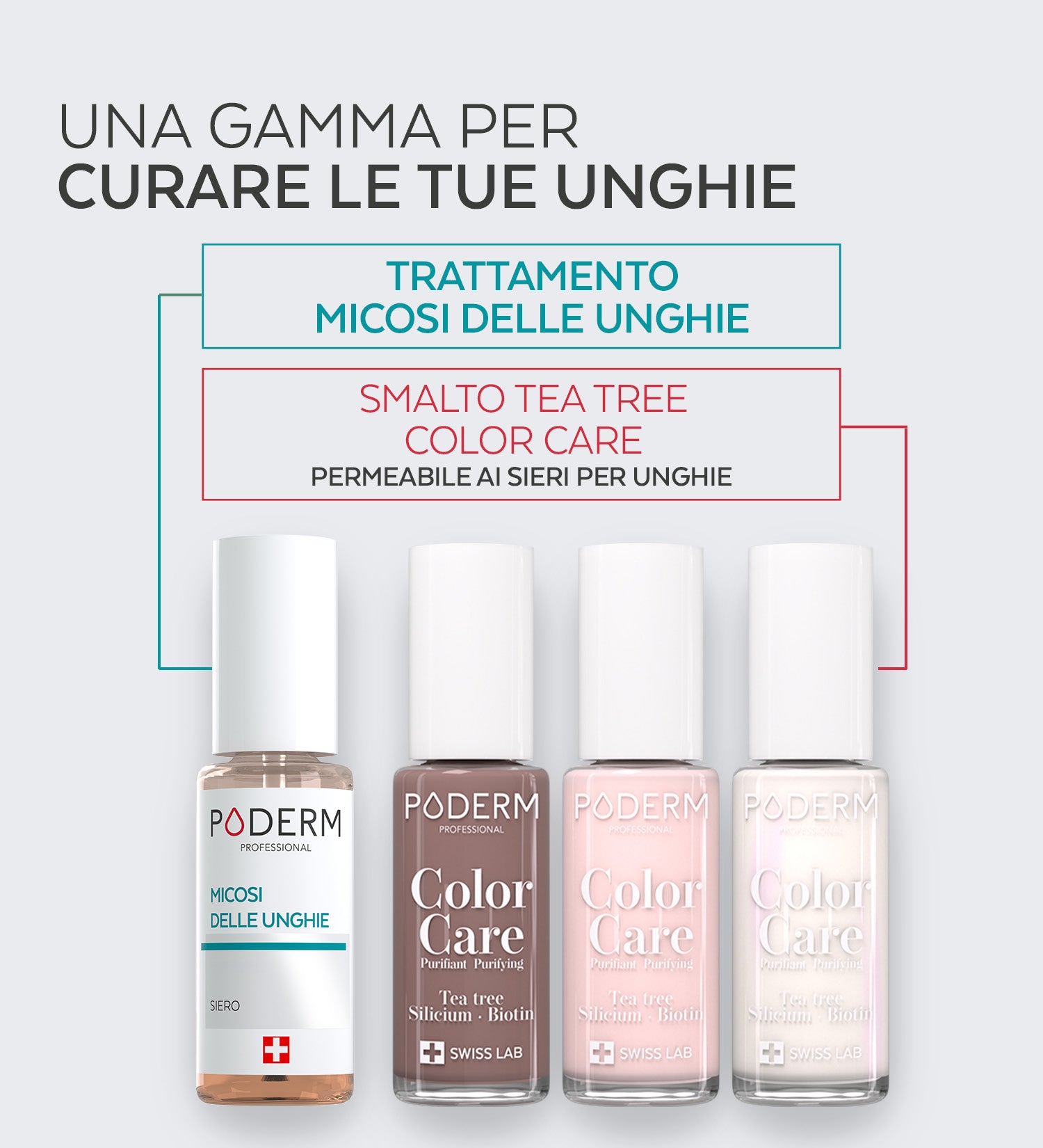 Lo smalto Color Care è stato appositamente studiato per correggere e nascondere le imperfezioni delle unghie gialle, danneggiate e striate, che possono essere causate da infezioni fungine, smalto in gel o semipermanente, o dall'uso di prodotti chimici come il gel idroalcolico. La sua formula traspirante e permeabile permette ai sieri PODERM di penetrare senza interrompere un trattamento in corso.