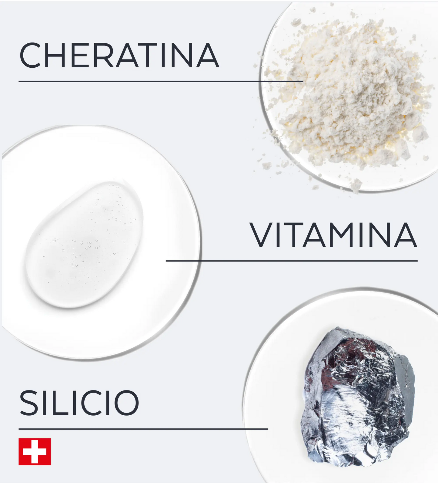 Il silicio è un oligoelemento naturalmente presente nella struttura dell'unghia, che assicura la coesione delle fibre di cheratina. La cheratina è una proteina essenziale che costituisce circa il 90% della struttura dell'unghia, contribuendo alla sua forza e resistenza.