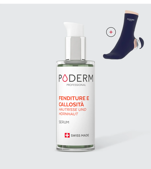 Il trattamento PODERM® Cura screpolature e callosità agisce per riparare le screpolature in 7 giorni e favorire la rigenerazione dei tessuti. È composto da due elementi che lavorano in sinergia: 1 siero ultra-concentrato e 1 paio di calze gel.