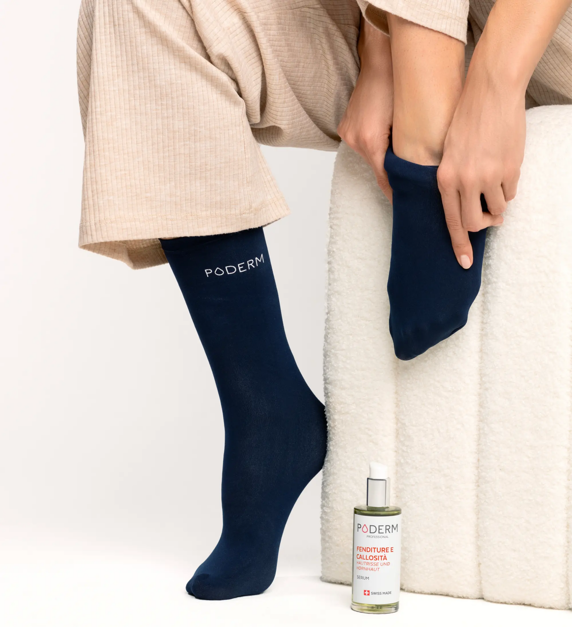 PODERM® Intensive Night Care for Cracks and Calluses è una combinazione unica e brevettata di PODERM® Cracks and Calluses Serum e un paio di PODERM® Repair Gel Socks. Mentre dormite, questo trattamento allevia il disagio causato dal contatto con le screpolature, ammorbidisce i calli e chiude le fessure.