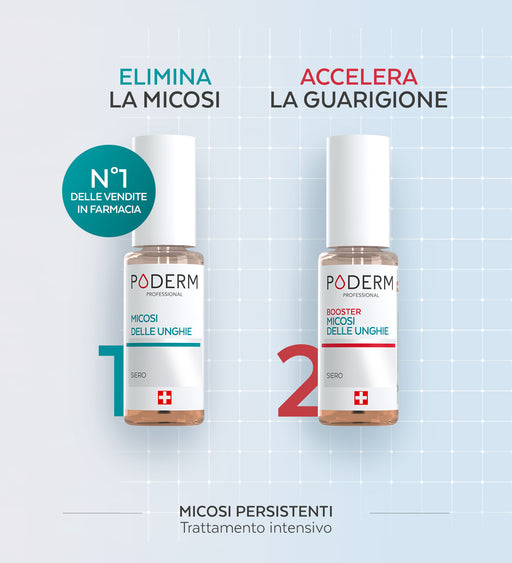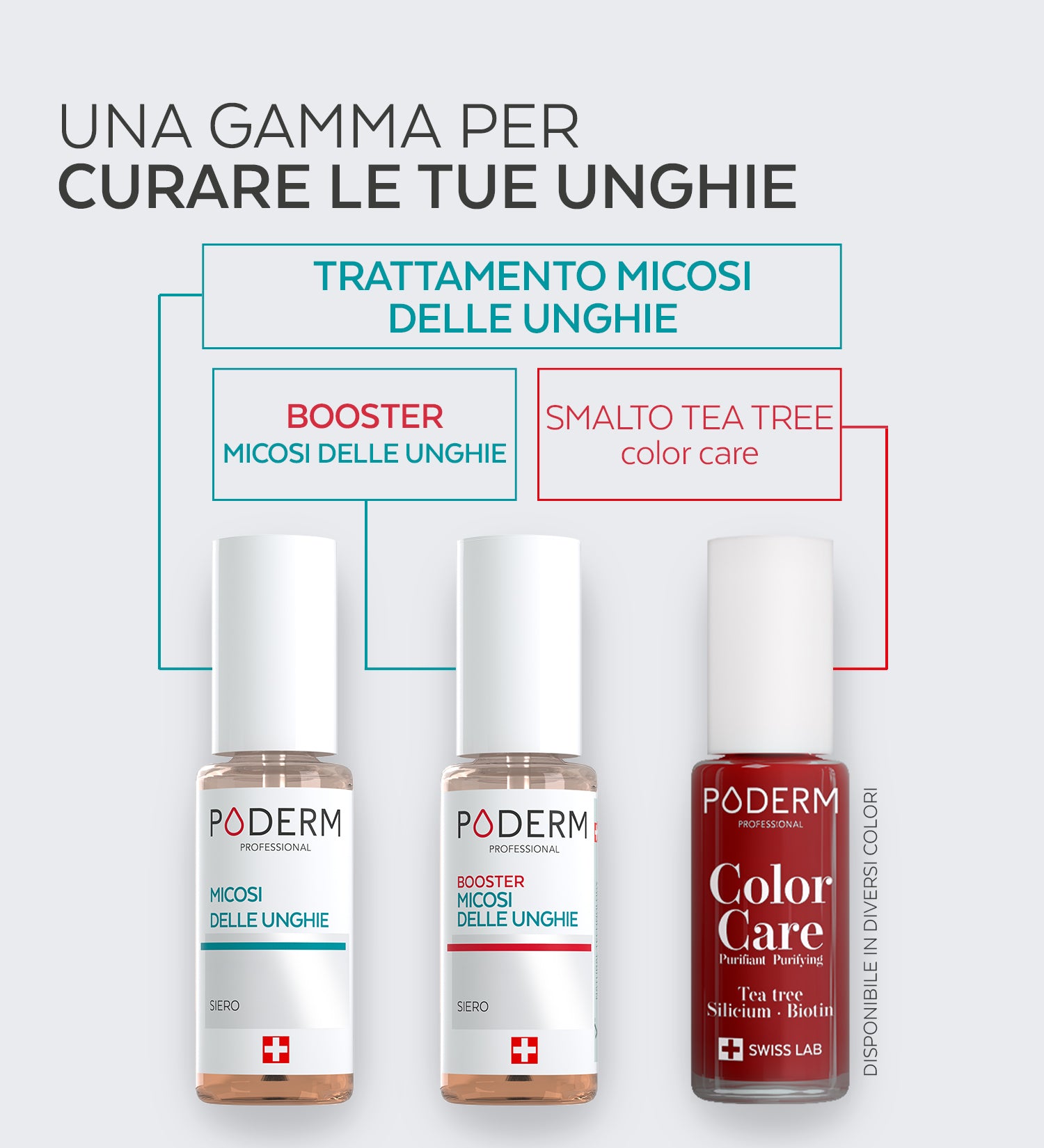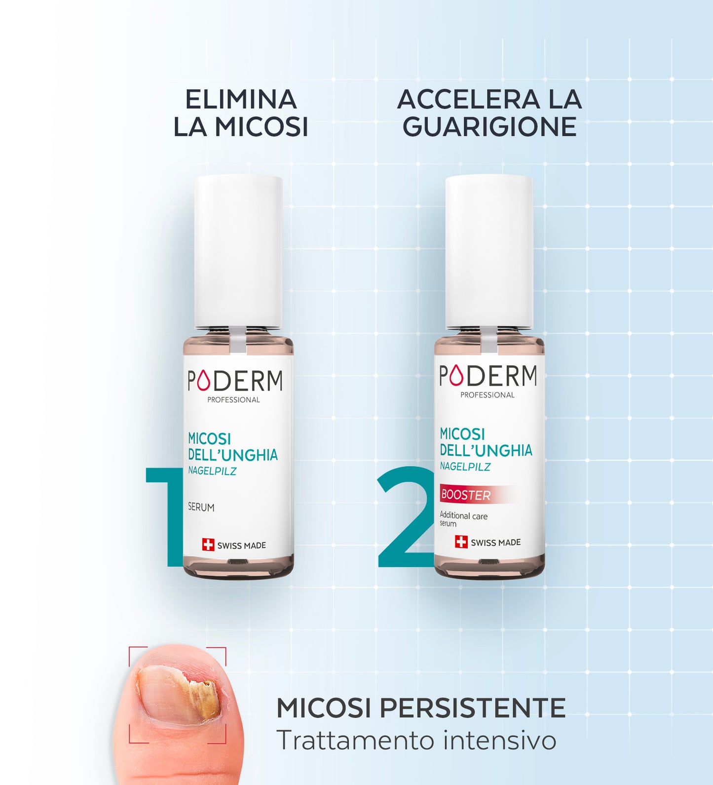 Per mantenere la pelle e le unghie dei piedi in buona salute, si consiglia di rivolgersi a un podologo una o due volte l'anno. Sia per la prevenzione che per il trattamento, PODERM® ha sviluppato dei sieri naturali che migliorano l'aspetto delle unghie rispettandone la matrice. Il miglioramento delle unghie è visibile fin dalla prima applicazione di PODERM® Siero per Micosi delle Unghie. Tuttavia, è necessario applicare il prodotto fino alla completa ricrescita dell'unghia. Ciò può richiedere diversi mesi: un'unghia richiede da uno a quattro mesi e le unghie dei piedi da sei a dodici mesi per ricrescere completamente. Booster Serum aiuta ad accelerare il trattamento delle infezioni fungine e a ottenere risultati soddisfacenti in tempi molto più brevi.