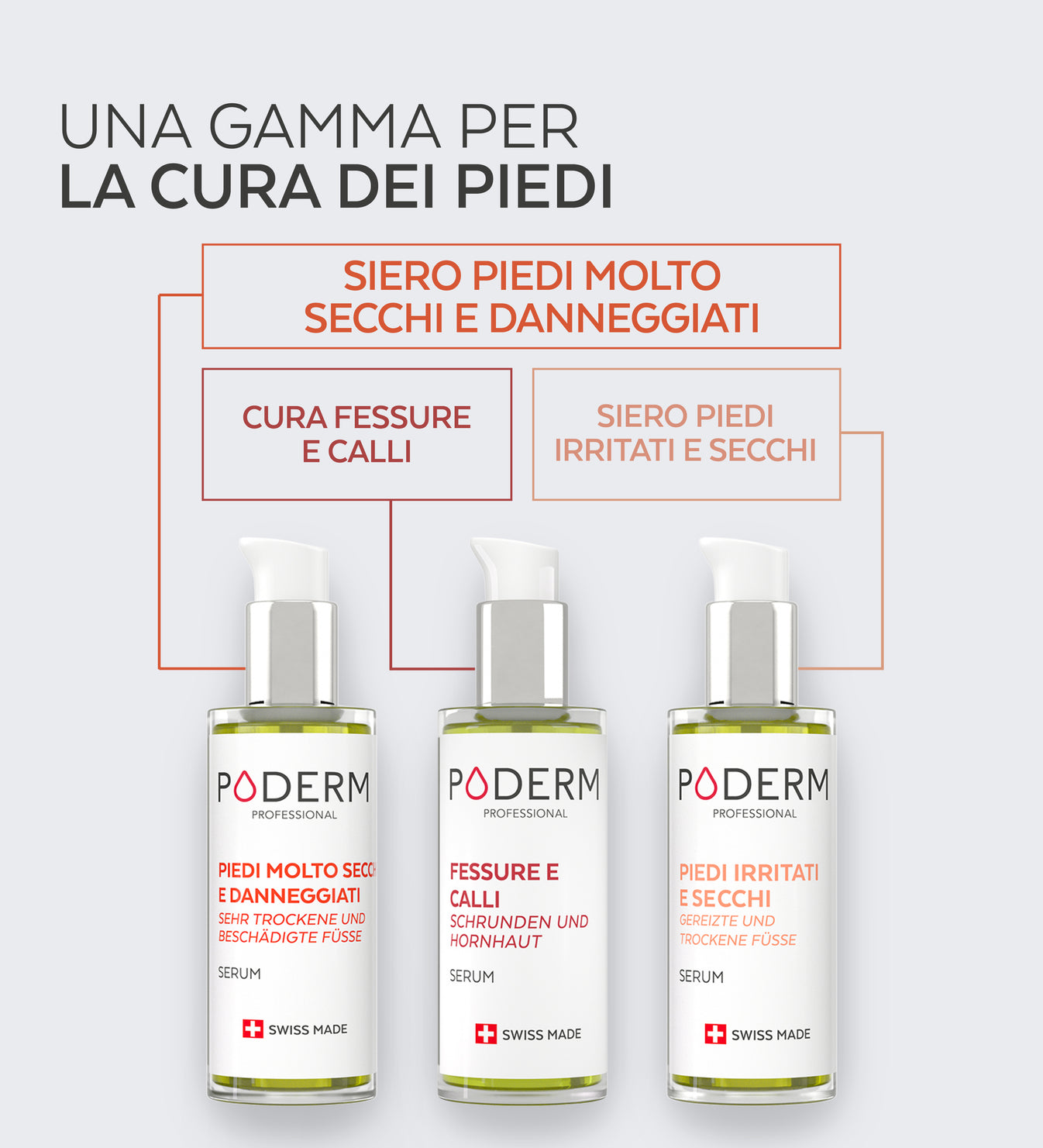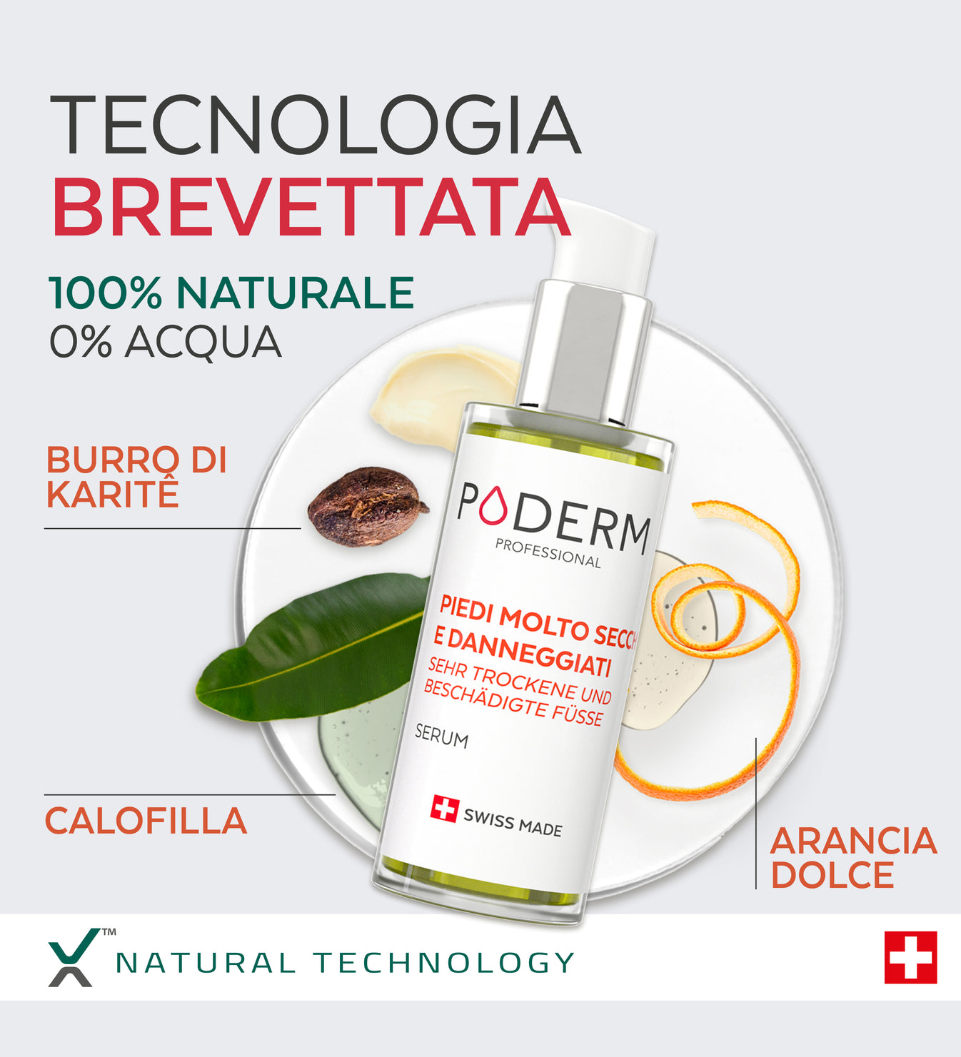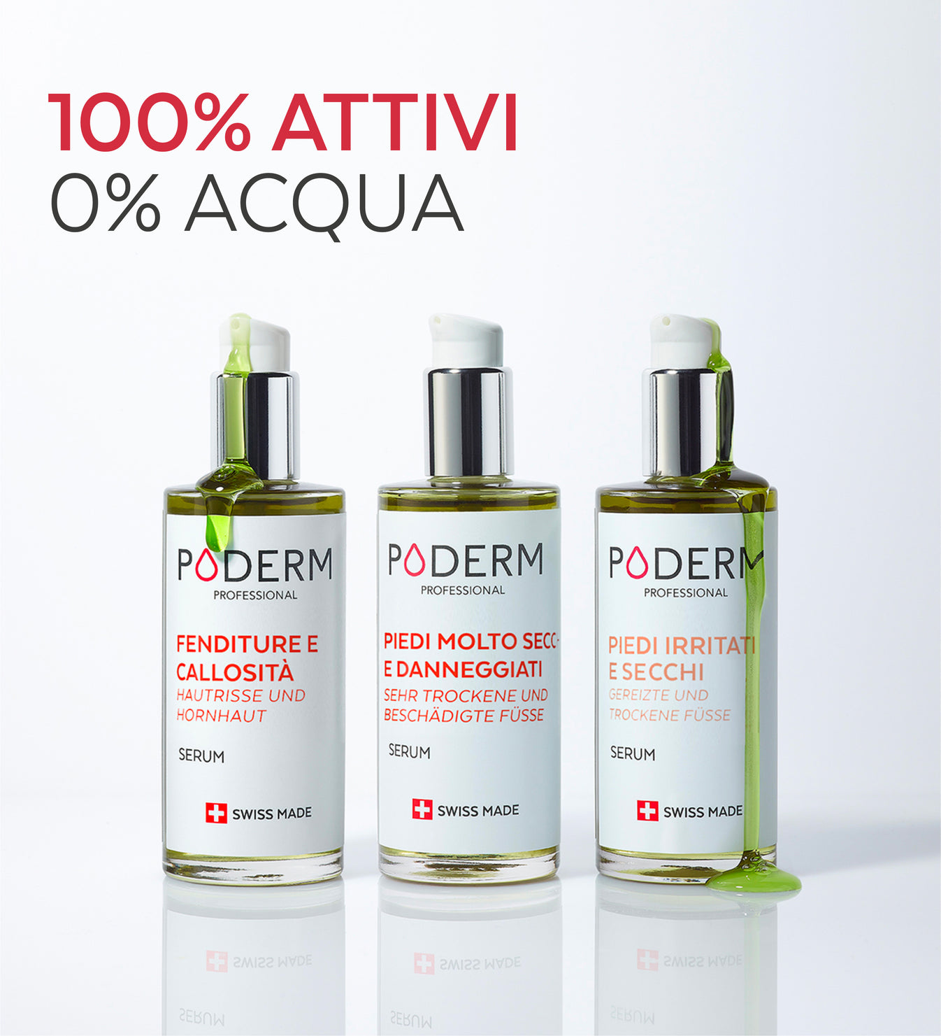 La maggior parte dei prodotti in commercio per i piedi secchi sono creme o balsami a base di acqua, con un'alta percentuale di acqua nella loro composizione. I sieri per piedi Poderm, invece, sono concentrati al 100% in principi attivi e contengono lo 0% di acqua, il che aiuta a prevenire i disturbi della pelle. La loro texture oleosa assicura un'applicazione delicata e un rapido assorbimento nella pelle, garantendo la massima efficacia. Inoltre, grazie alla loro formula ultra-concentrata, una piccola quantità di siero è sufficiente per coprire un'ampia superficie.