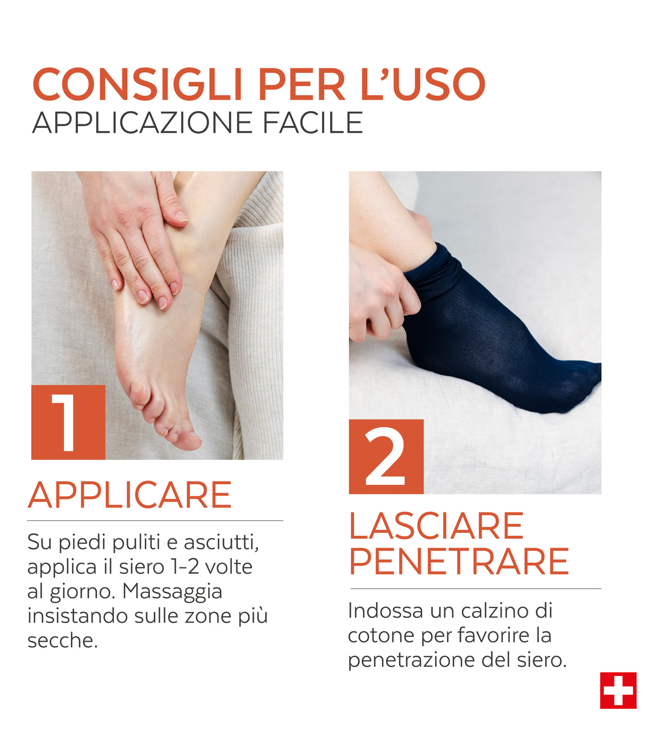 Sui piedi puliti e asciutti, applicare il siero da 1 a 2 volte al giorno. Massaggiare delicatamente, prestando particolare attenzione alle zone più secche e danneggiate.