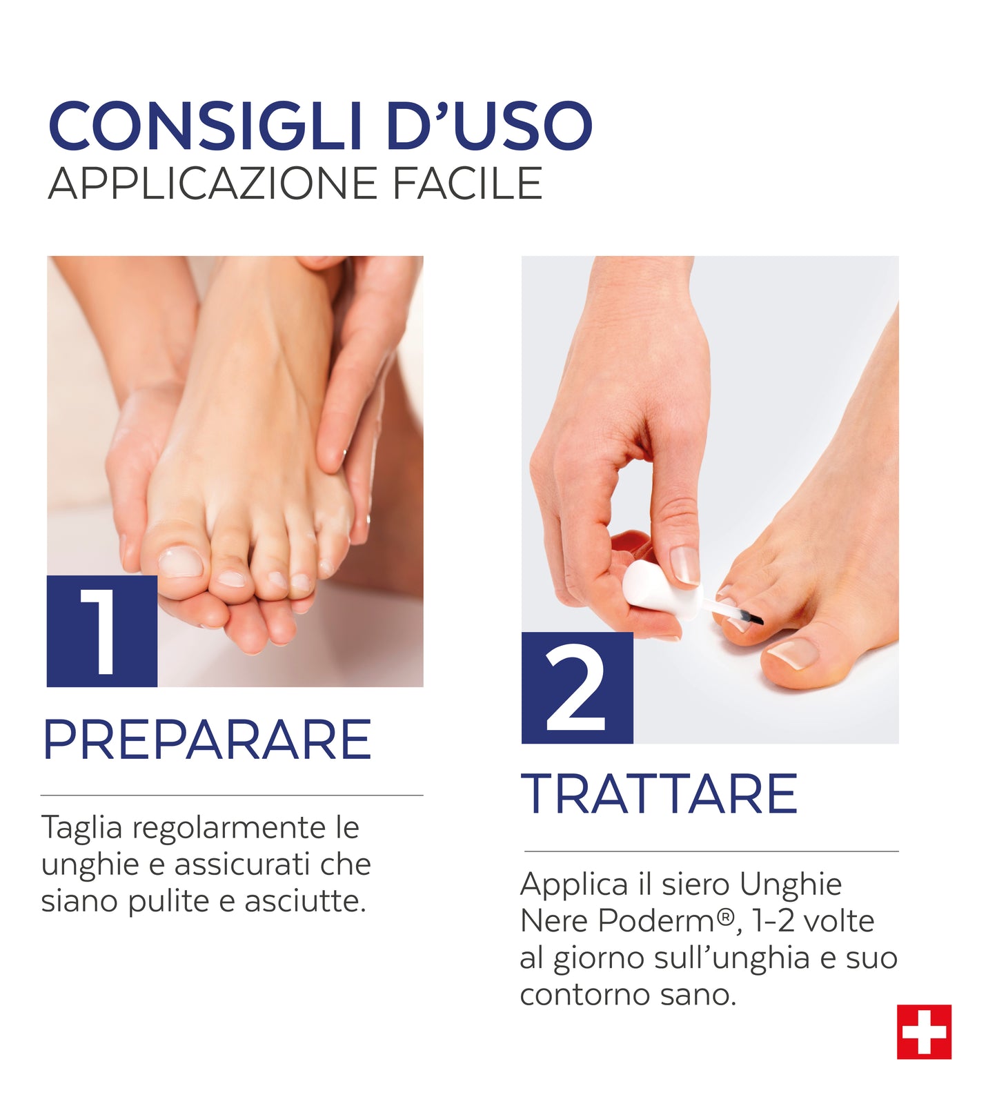 Applicare il siero PODERM® una o due volte al giorno sull'unghia e intorno all'unghia. Lasciare agire.