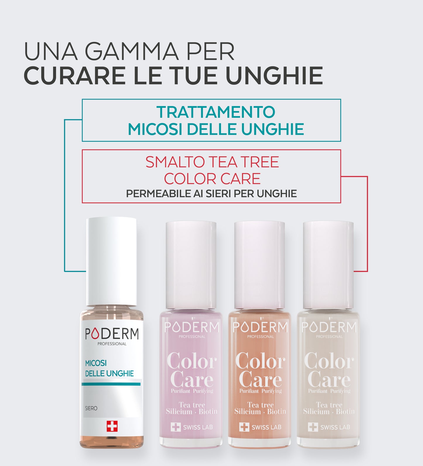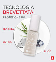 Lo smalto Color Care è stato appositamente studiato per correggere e nascondere le imperfezioni delle unghie gialle, danneggiate e striate, che possono essere causate da infezioni fungine, smalto in gel o semipermanente, o dall'uso di prodotti chimici come il gel idroalcolico. La sua formula traspirante e permeabile permette ai sieri PODERM di penetrare senza interrompere un trattamento in corso.