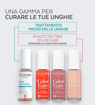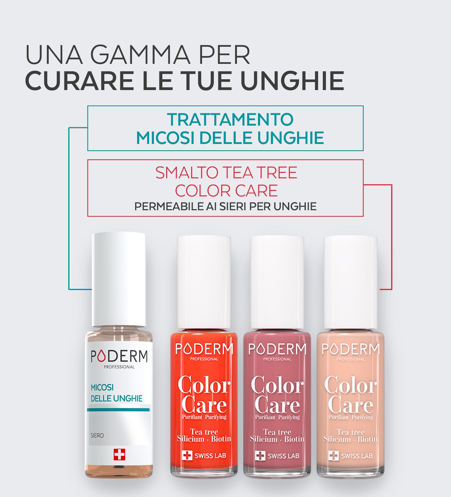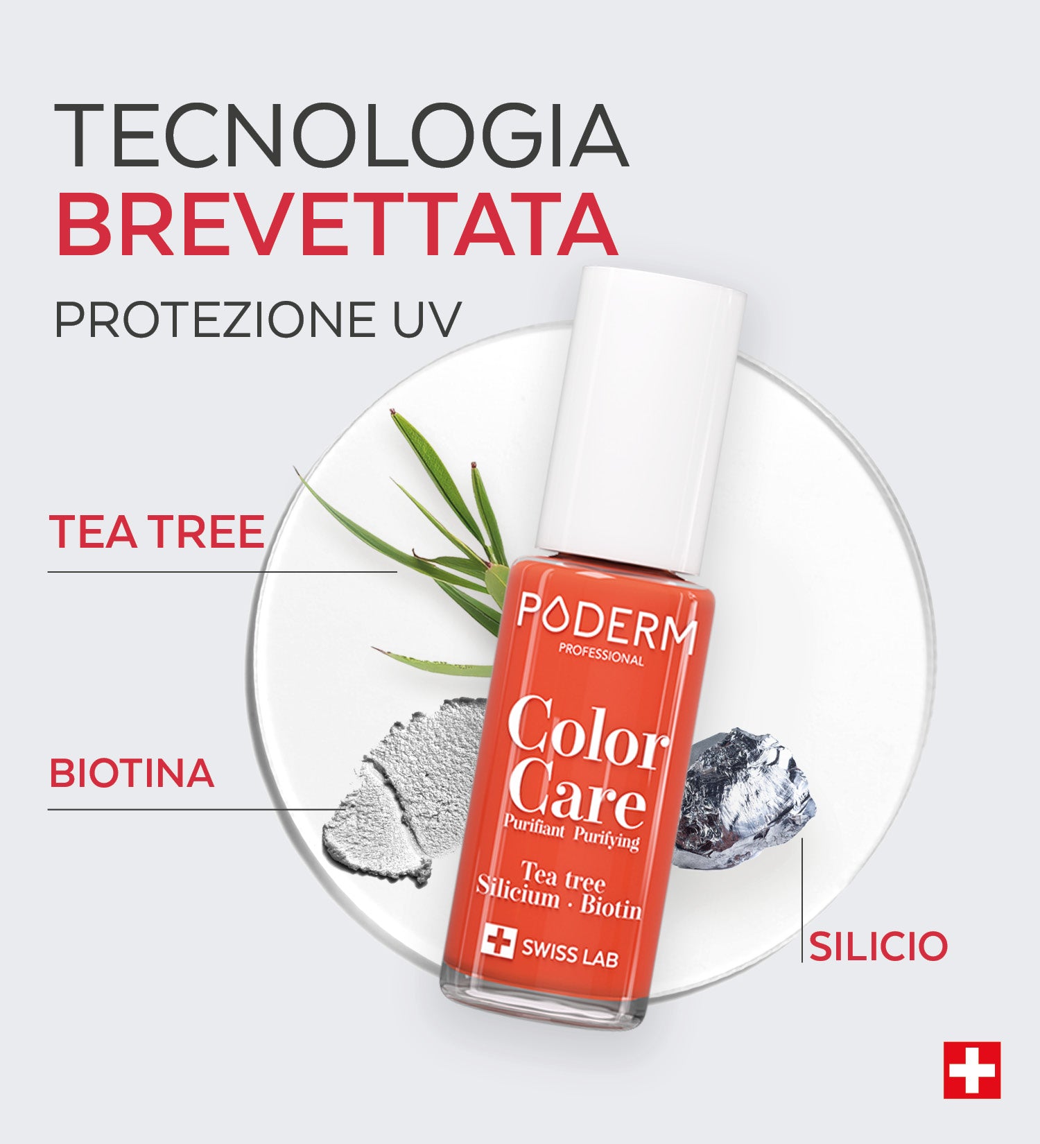 Lo smalto Color Care è stato appositamente studiato per correggere e nascondere le imperfezioni delle unghie gialle, danneggiate e striate, che possono essere causate da infezioni fungine, smalto in gel o semipermanente, o dall'uso di prodotti chimici come il gel idroalcolico. La sua formula traspirante e permeabile permette ai sieri PODERM di penetrare senza interrompere un trattamento in corso.