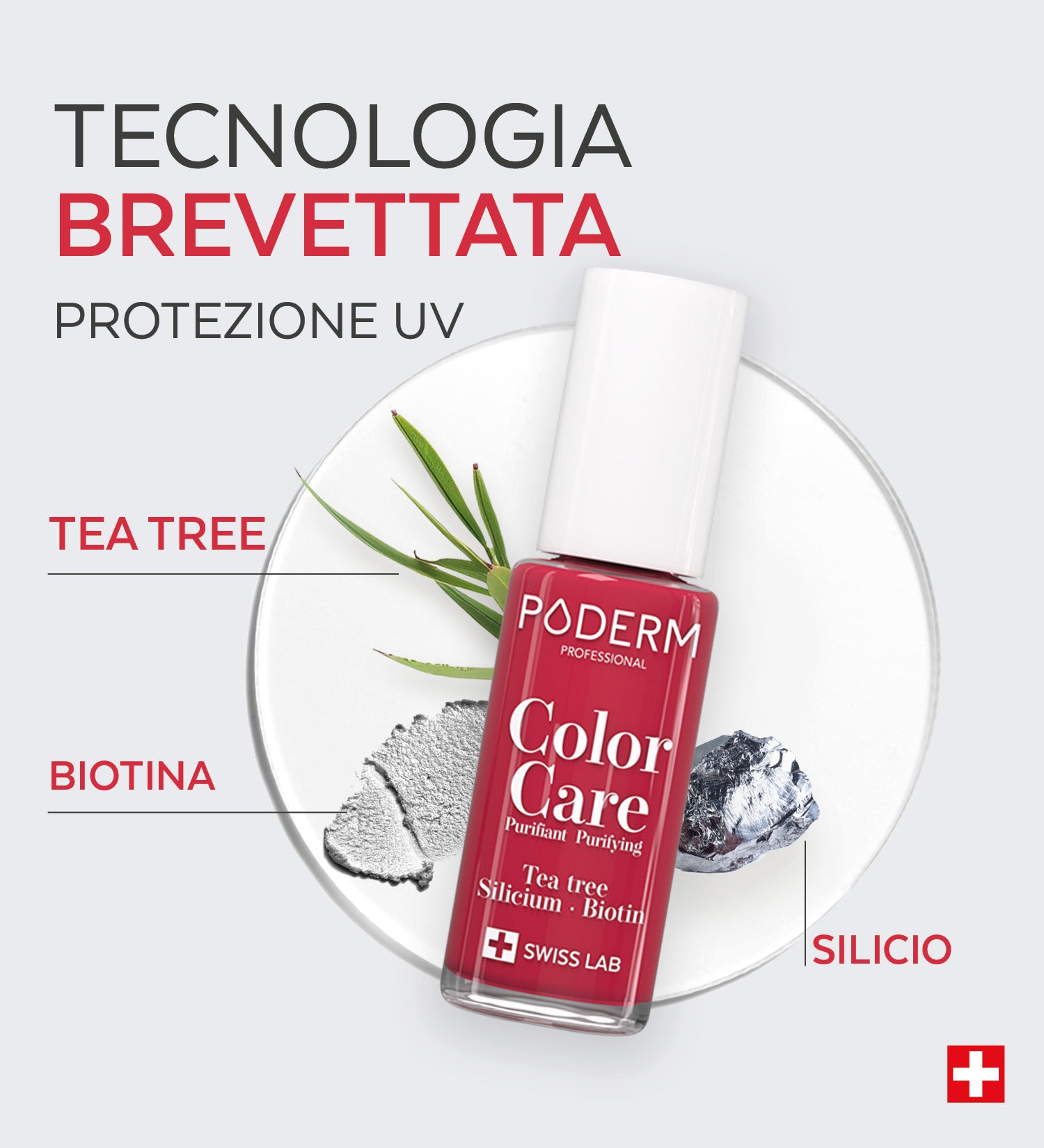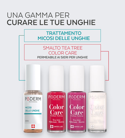 Lo smalto Color Care è stato appositamente studiato per correggere e nascondere le imperfezioni delle unghie gialle, danneggiate e striate, che possono essere causate da infezioni fungine, smalto in gel o semipermanente, o dall'uso di prodotti chimici come il gel idroalcolico. La sua formula traspirante e permeabile permette ai sieri PODERM di penetrare senza interrompere un trattamento in corso.