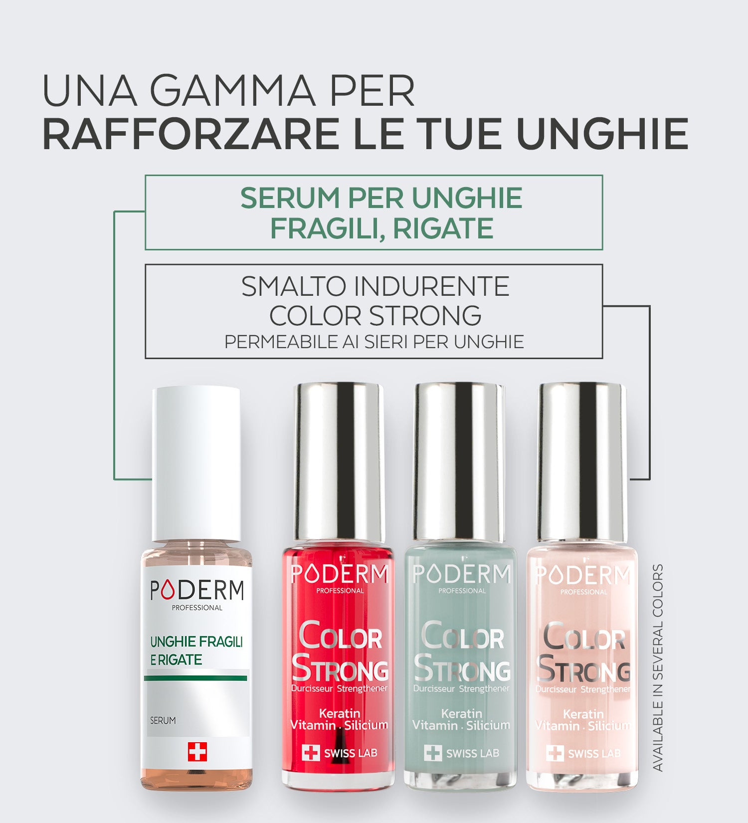 La gamma di smalti fortificanti Color Strong è composta da 12 colori luminosi per tutte le occasioni, oltre a una base e un top coat per una manicure completa. Gli smalti Color Strong sono facili da rimuovere grazie al Remover Extra Delicato PODERM®, che rimuove lo smalto lasciando l'unghia lucida e nutrita grazie alla sua formula priva di acetone.