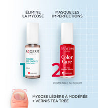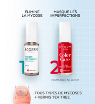 Le Pack Duo Color Care - Mycose des ongles PODERM® combine deux produits essentiels pour un traitement efficace et esthétique des ongles abîmés par les mycoses. Ce duo comprend le Sérum Mycose des ongles pour traiter et le Vernis Color Care pour camoufler et soigner les ongles abîmés.