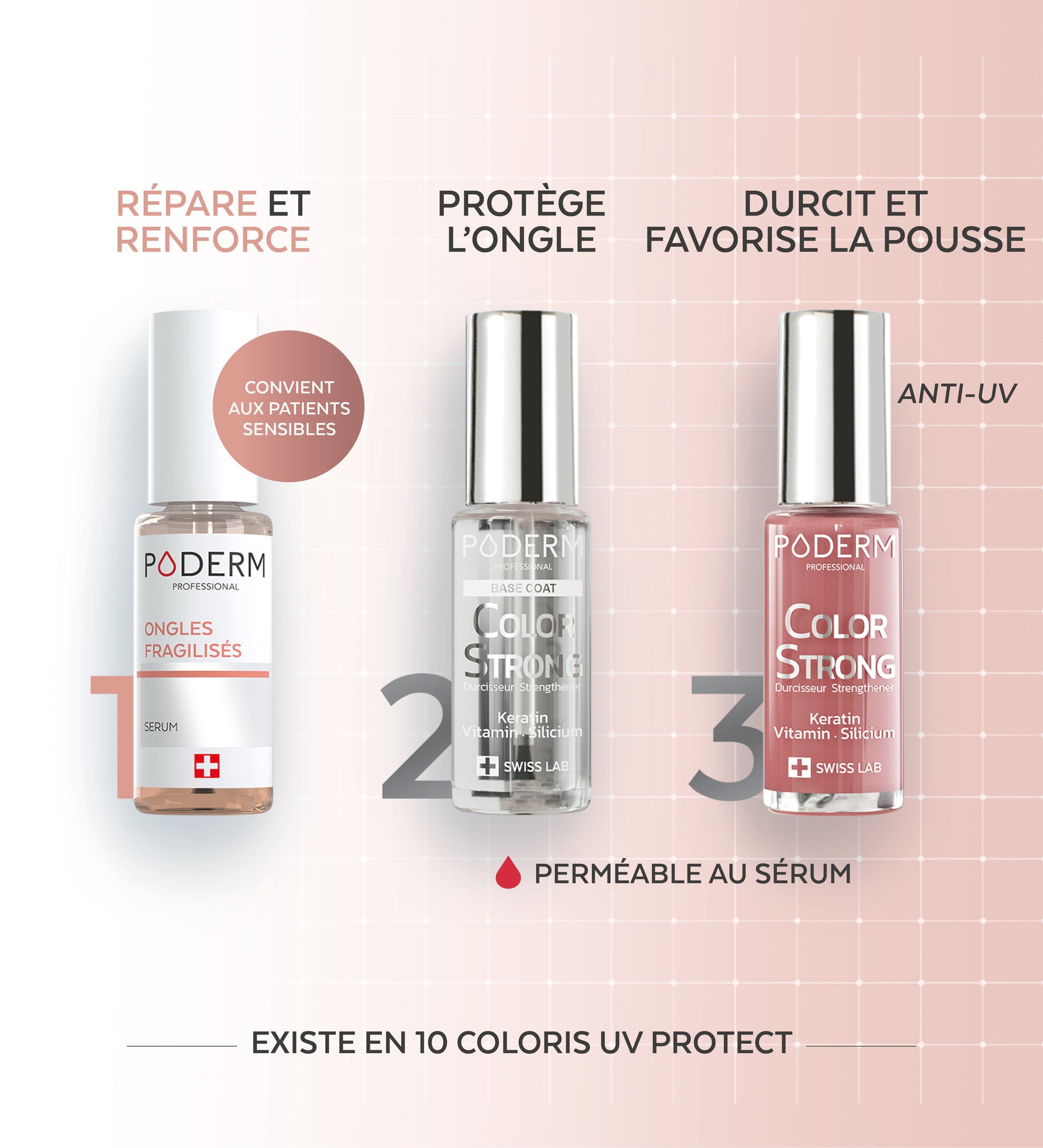 Cassures, stries, décoloration, décollement… les effets secondaires sur les ongles sont fréquents. Afin d’accompagner les patients tout au long de leur parcours de soin, Poderm a développé ce pack composé de trois soins complémentaires enrichis en silicium, pensés pour protéger et renforcer les ongles fragilisés.
